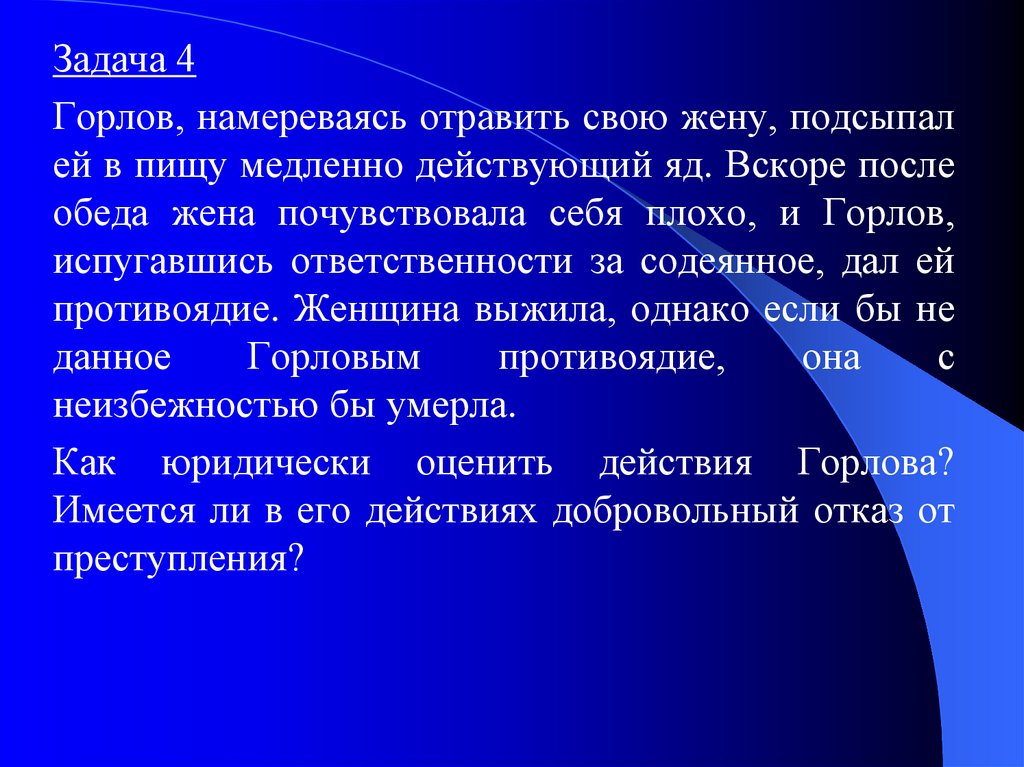 Задача 4Горлов, намереваясь отравить свою жену, подсыпал