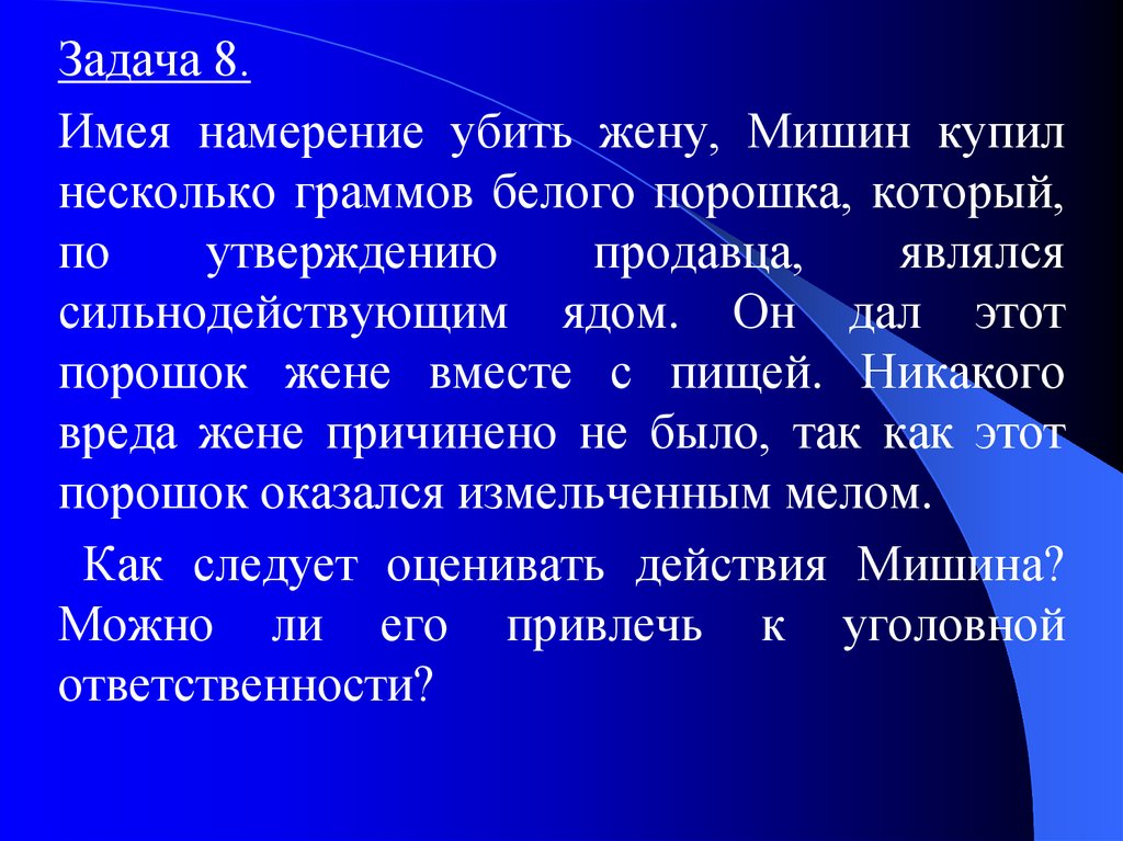Задача 8.Имея намерение убить жену, Мишин купил