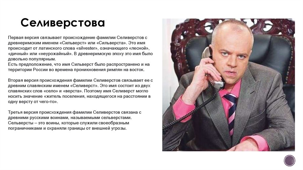 СеливерстоваПервая версия связывает происхождение фамилии Селиверстов с