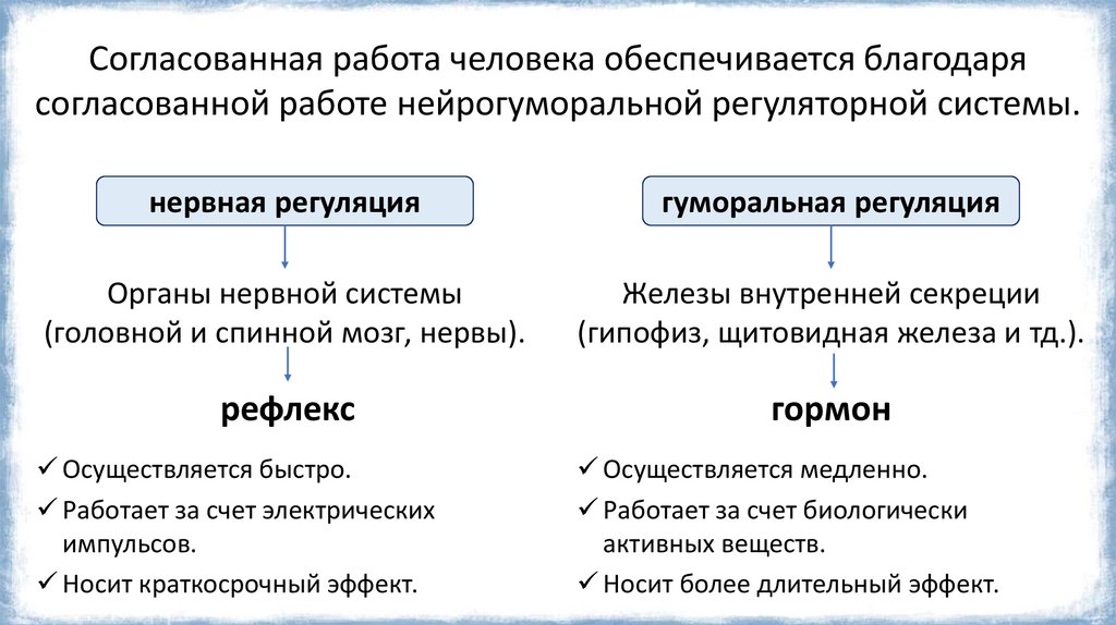 Согласованная работа человека обеспечивается благодарясогласованной работе нейрогуморальной регуляторной системы.