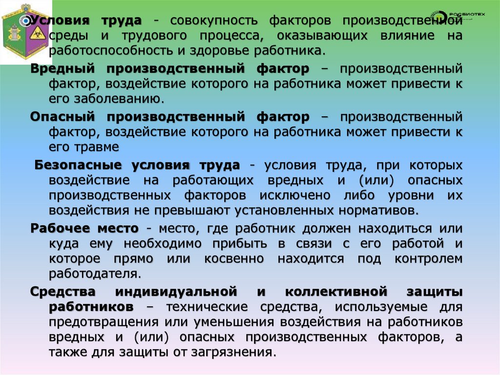 Условия труда - совокупность факторов производственнойсреды и трудового процесса, оказывающих влияние на