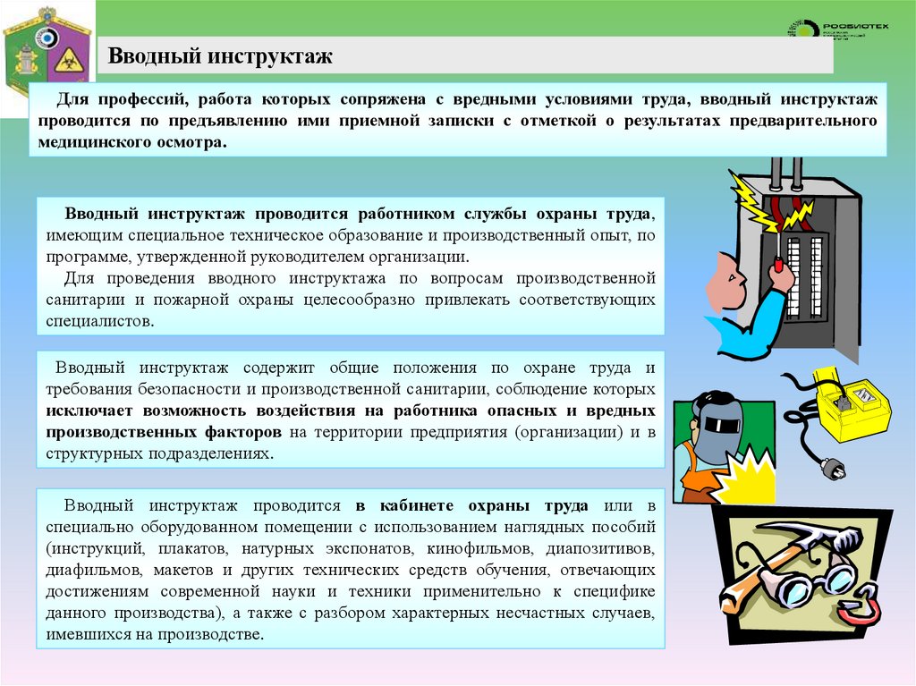 Вводный инструктажДля профессий, работа которых сопряжена с вредными условиями труда, вводный инструктаж