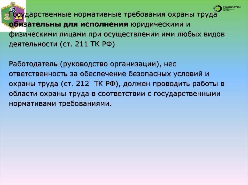 Государственные нормативные требования охраны трудаобязательны для исполнения юридическими и