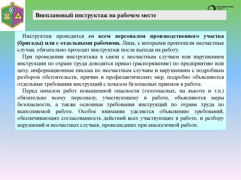 Внеплановый инструктаж на рабочем местеИнструктаж проводится со всем персоналом производственного участка