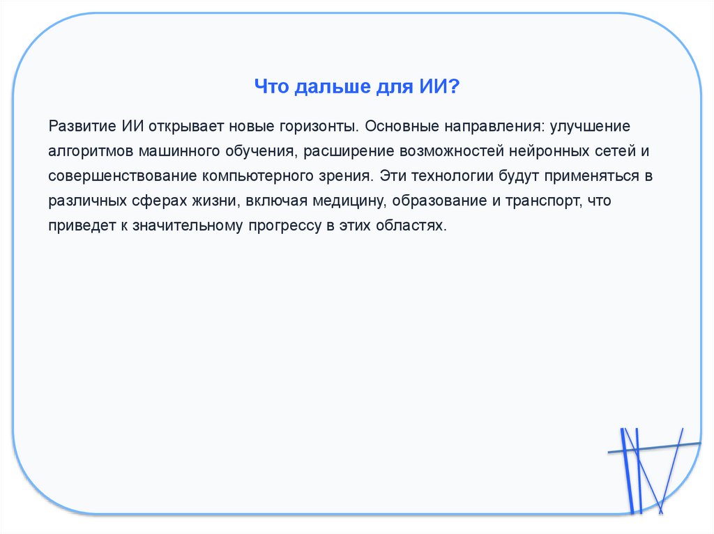 Что дальше для ИИ?Развитие ИИ открывает новые горизонты. Основные направления: улучшение