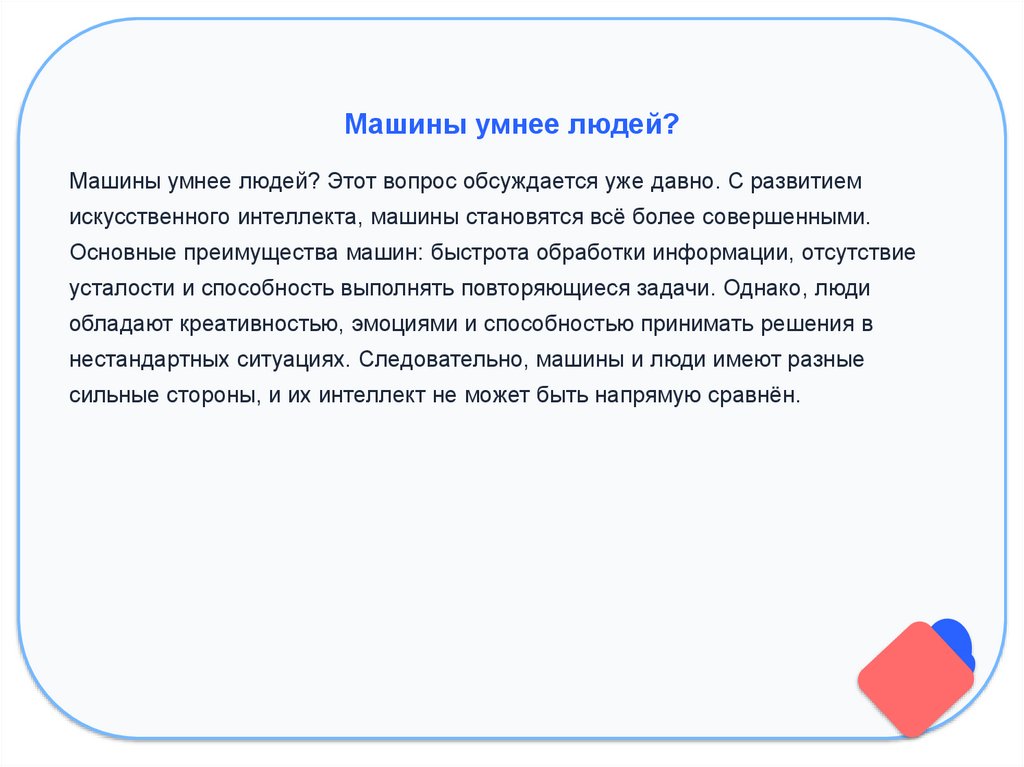 Основные преимущества машин: быстрота обработки информации, отсутствие