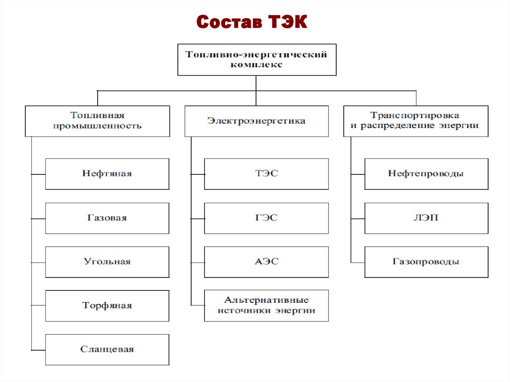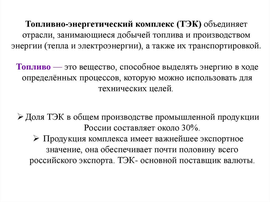 Топливно-энергетический комплекс (ТЭК) объединяетотрасли, занимающиеся добычей топлива и производством