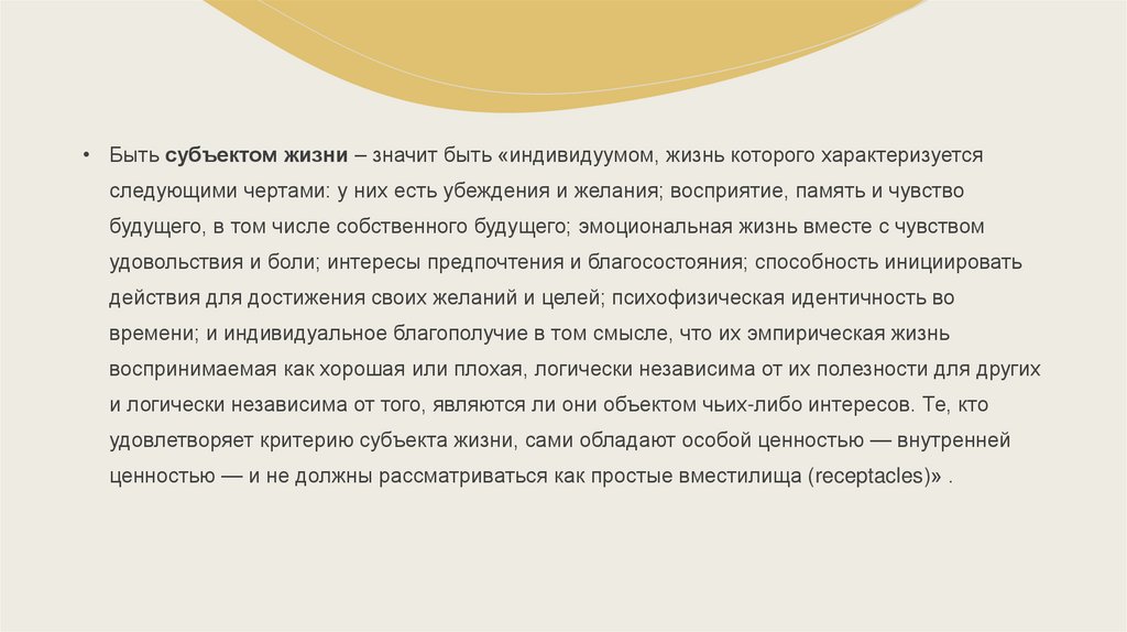 • Быть субъектом жизни – значит быть «индивидуумом, жизнь которого характеризуетсяследующими чертами: у них есть убеждения и желания; восприятие, память и чувство