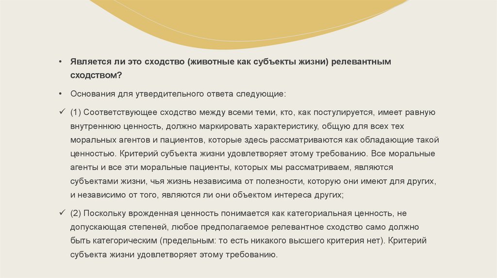 • Является ли это сходство (животные как субъекты жизни) релевантнымсходством?