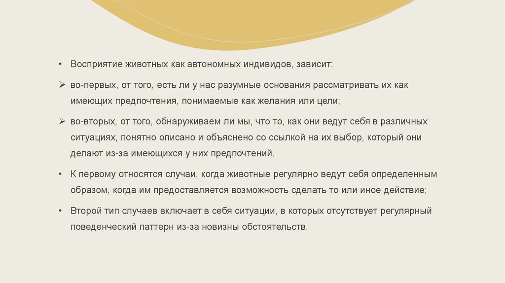 • Восприятие животных как автономных индивидов, зависит:во-первых, от того, есть ли у нас разумные основания рассматривать их как