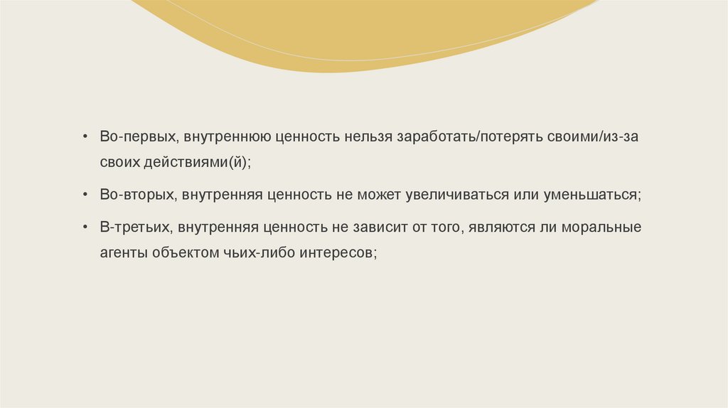 • Во-первых, внутреннюю ценность нельзя заработать/потерять своими/из-засвоих действиями(й);