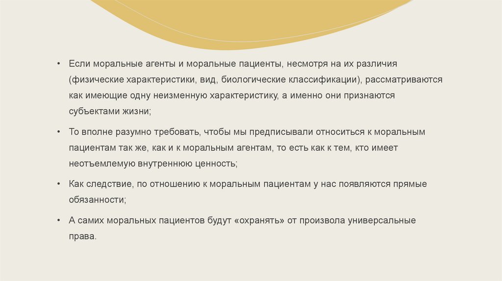 • Морального пациента следует понимать как того, кто имеет желания и убеждения,