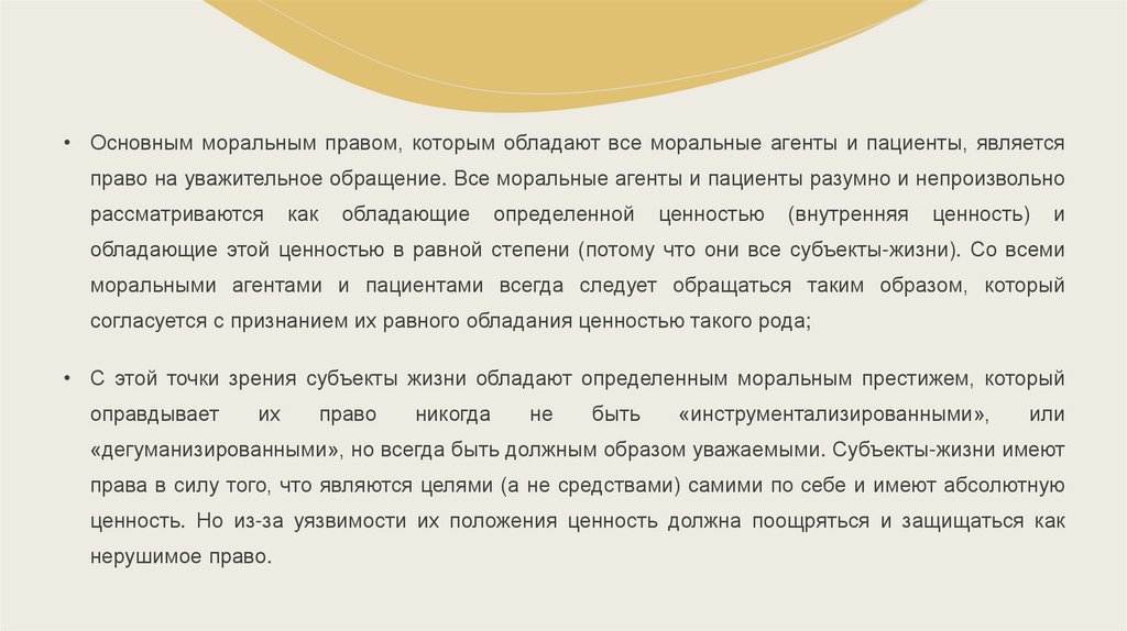 • Основным моральным правом, которым обладают все моральные агенты и пациенты, являетсяправо на уважительное обращение. Все моральные агенты и пациенты разумно и непроизвольно