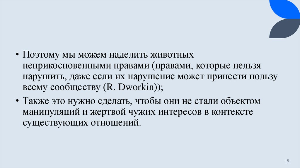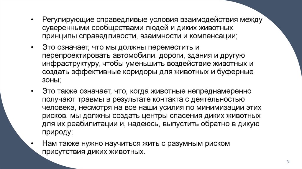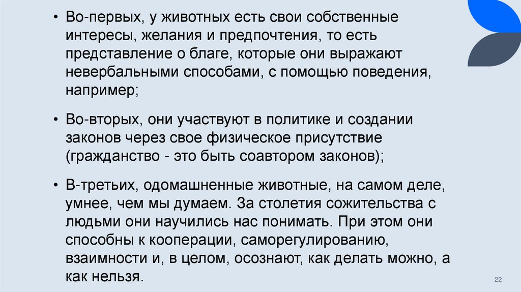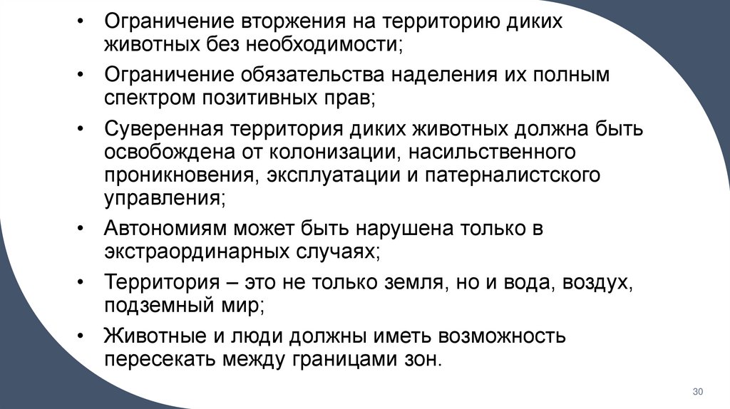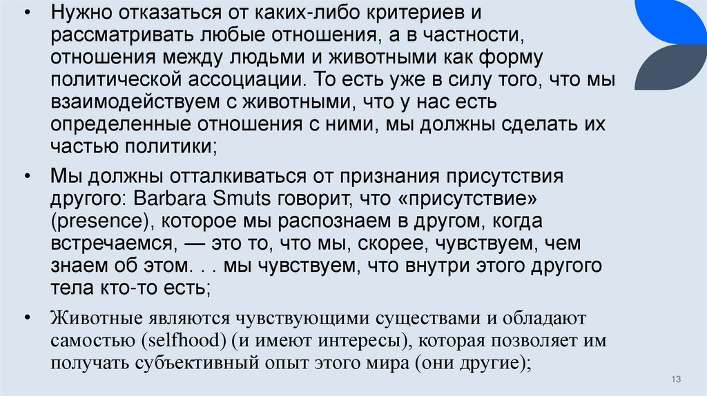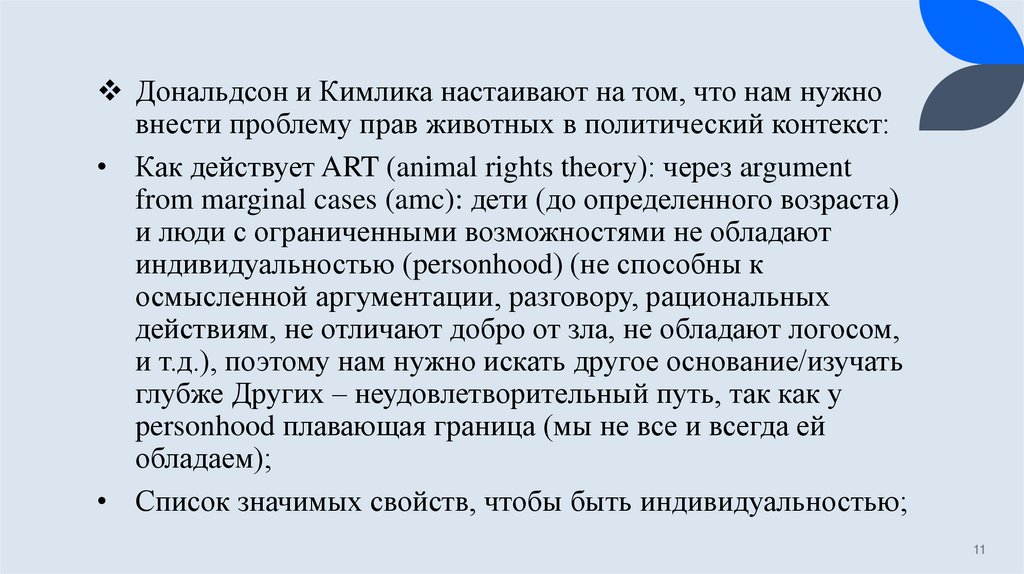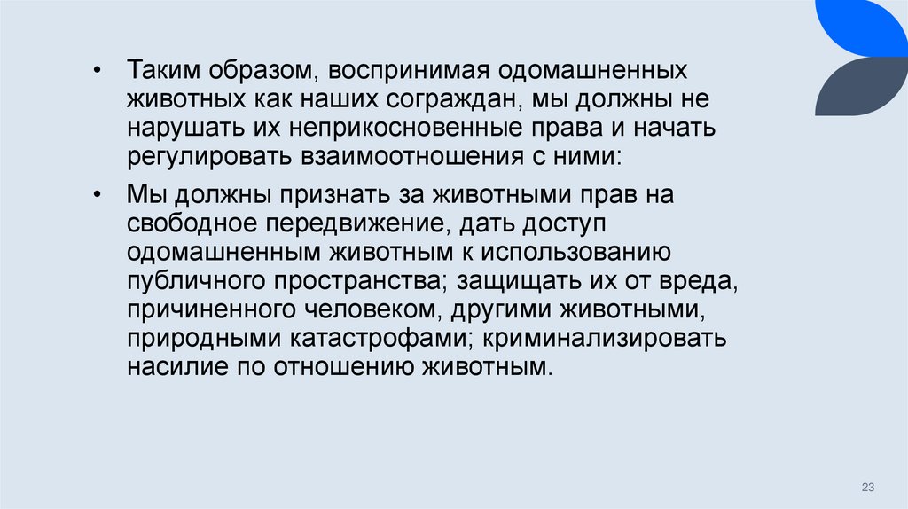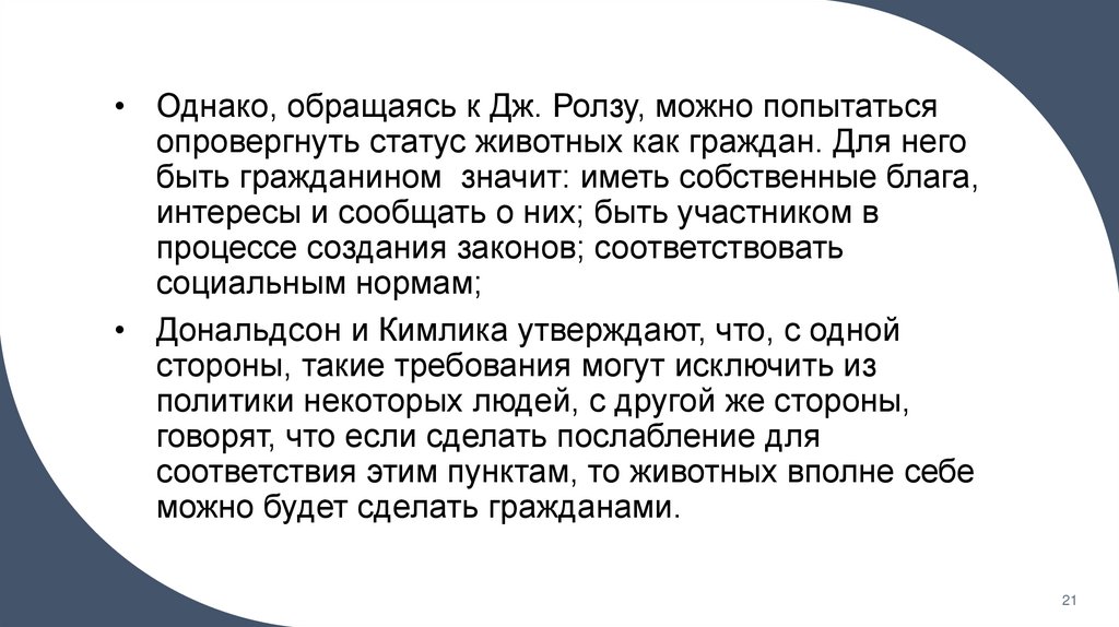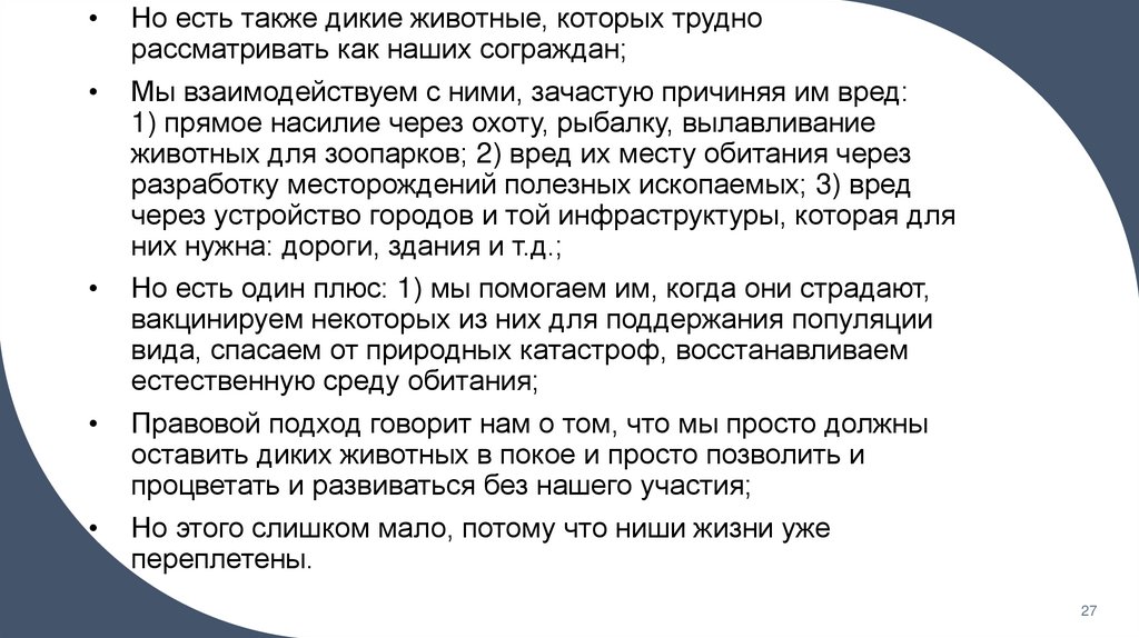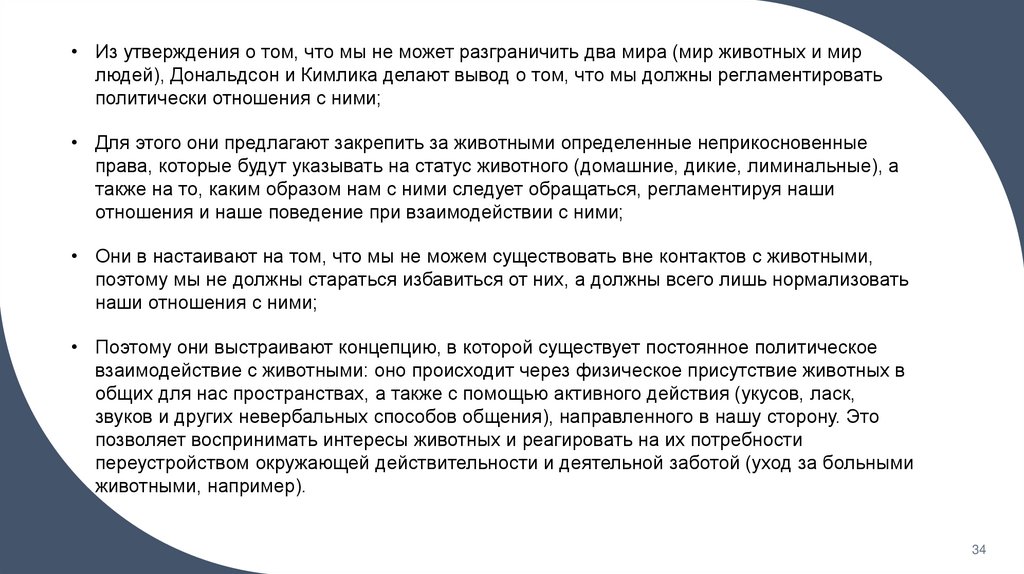 • Из утверждения о том, что мы не может разграничить два мира (мир животных и мирлюдей), Дональдсон и Кимлика делают вывод о том, что мы должны регламентировать