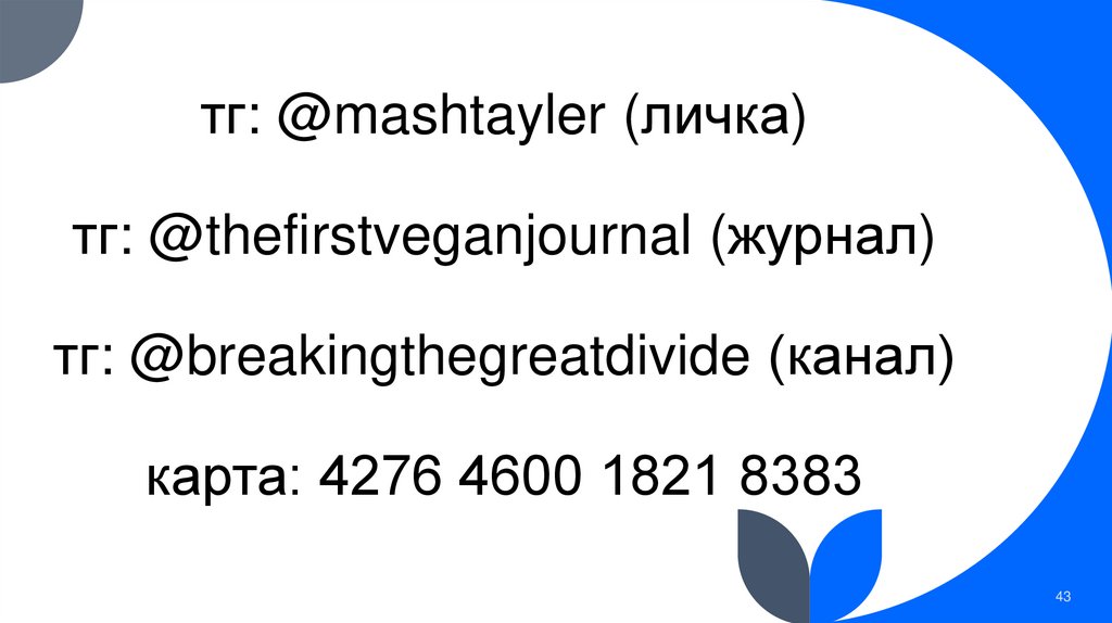 тг: @mashtayler (личка)тг: @thefirstveganjournal (журнал)
