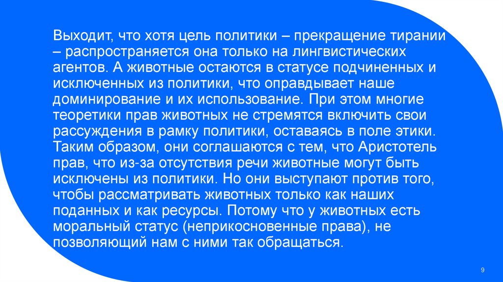 • В отличие от концепций прав животных, политический поворот больше не задаетсявопросом: из какой внутренней особенности животных могут быть выведены