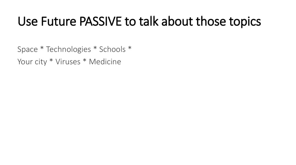 Use Future PASSIVE to talk about those topicsSpace * Technologies * Schools *