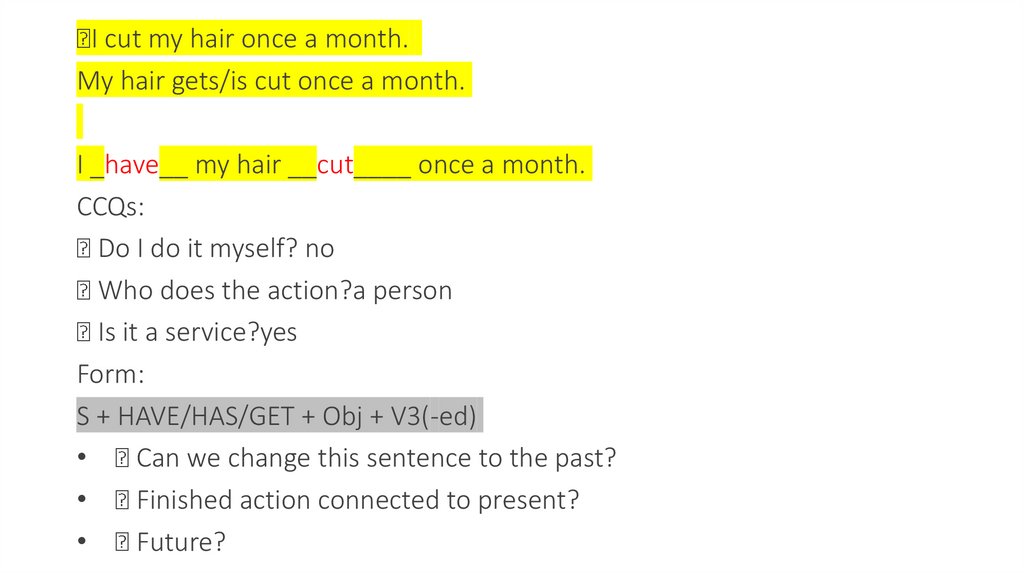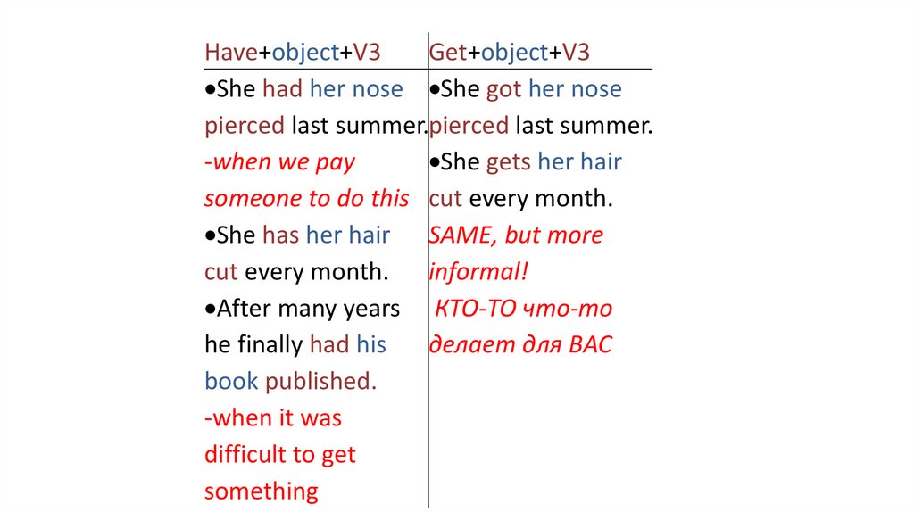 S + HAVE/HAS/GET + Obj + V3(-ed)