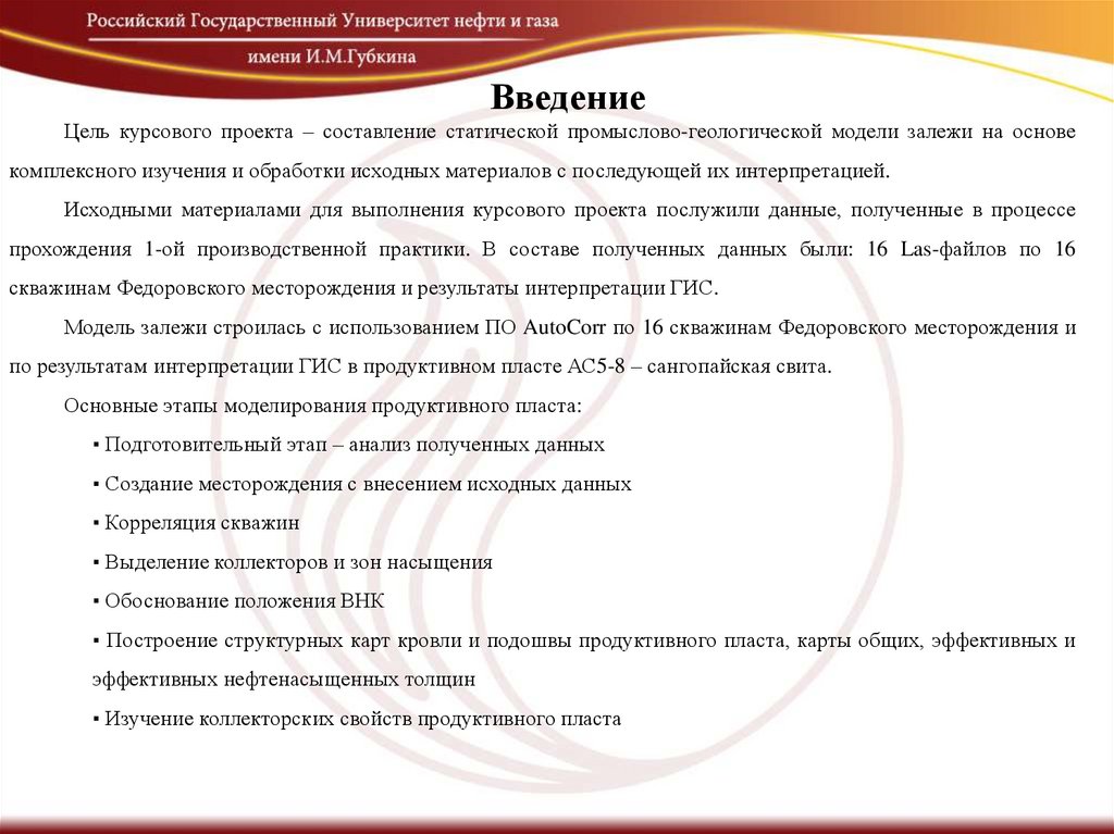 ВведениеЦель курсового проекта – составление статической промыслово-геологической модели залежи на основе