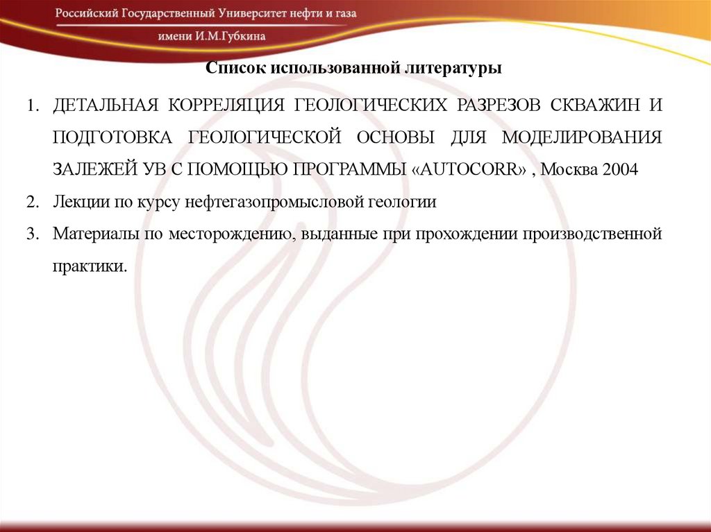 Список использованной литературы1. ДЕТАЛЬНАЯ КОРРЕЛЯЦИЯ ГЕОЛОГИЧЕСКИХ РАЗРЕЗОВ СКВАЖИН И
