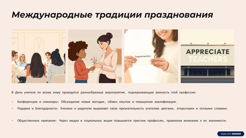 Международные традиции празднованияВ День учителя по всему миру проводятся разнообразные мероприятия, подчеркивающие важность этой профессии: