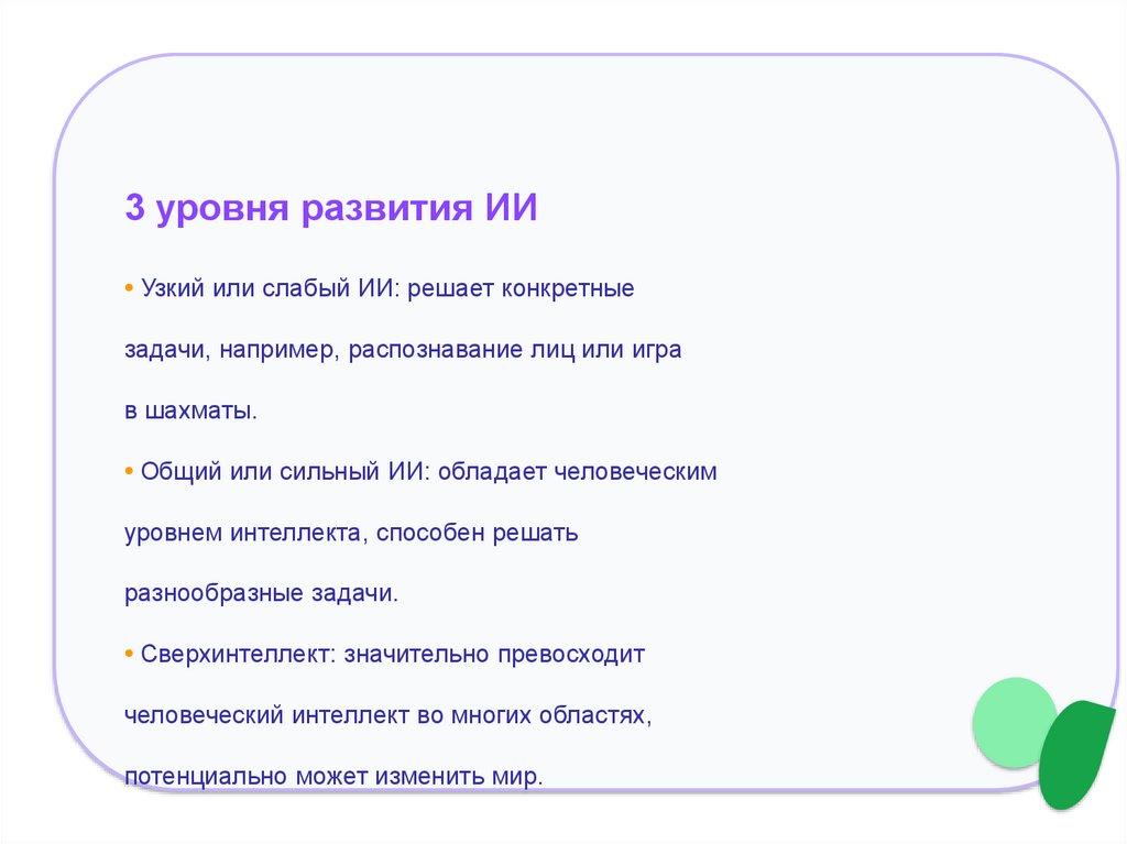 3 уровня развития ИИ• Узкий или слабый ИИ: решает конкретные
