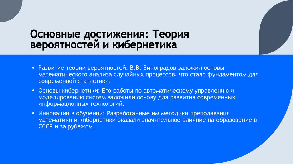 • Развитие теории вероятностей: В.В. Виноградов заложил основы