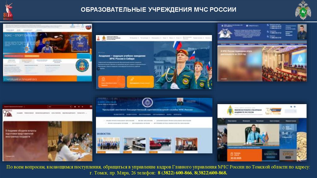 ОБРАЗОВАТЕЛЬНЫЕ УЧРЕЖДЕНИЯ МЧС РОССИИПо всем вопросам, касающимся поступления, обращаться в управление кадров Главного управления МЧС России по Томской области по адресу:
