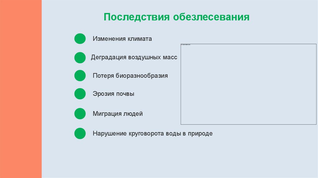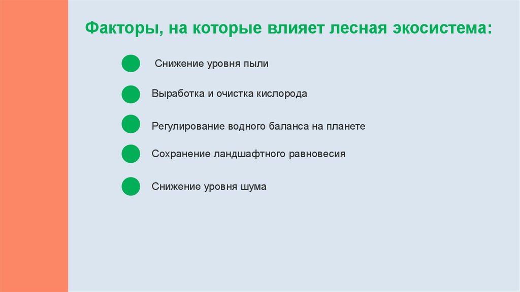 Факторы, на которые влияет лесная экосистема:Снижение уровня пыли