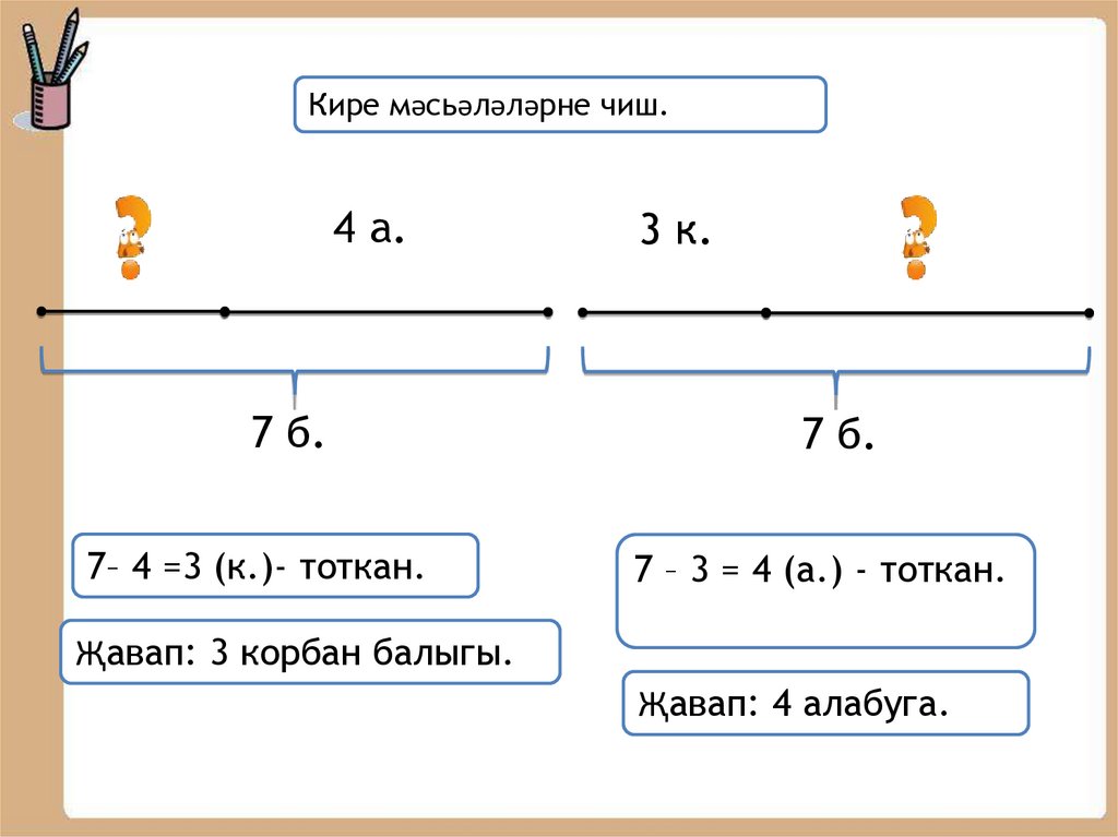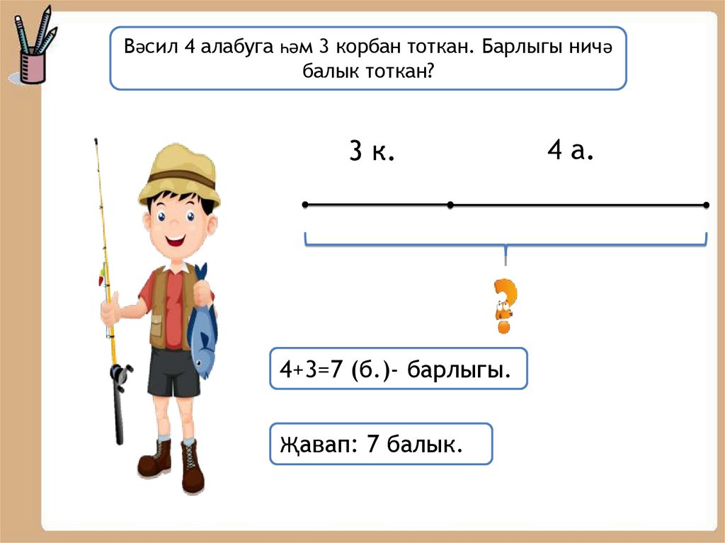 Вәсил 4 алабуга һәм 3 корбан тоткан. Барлыгы ничәбалык тоткан?