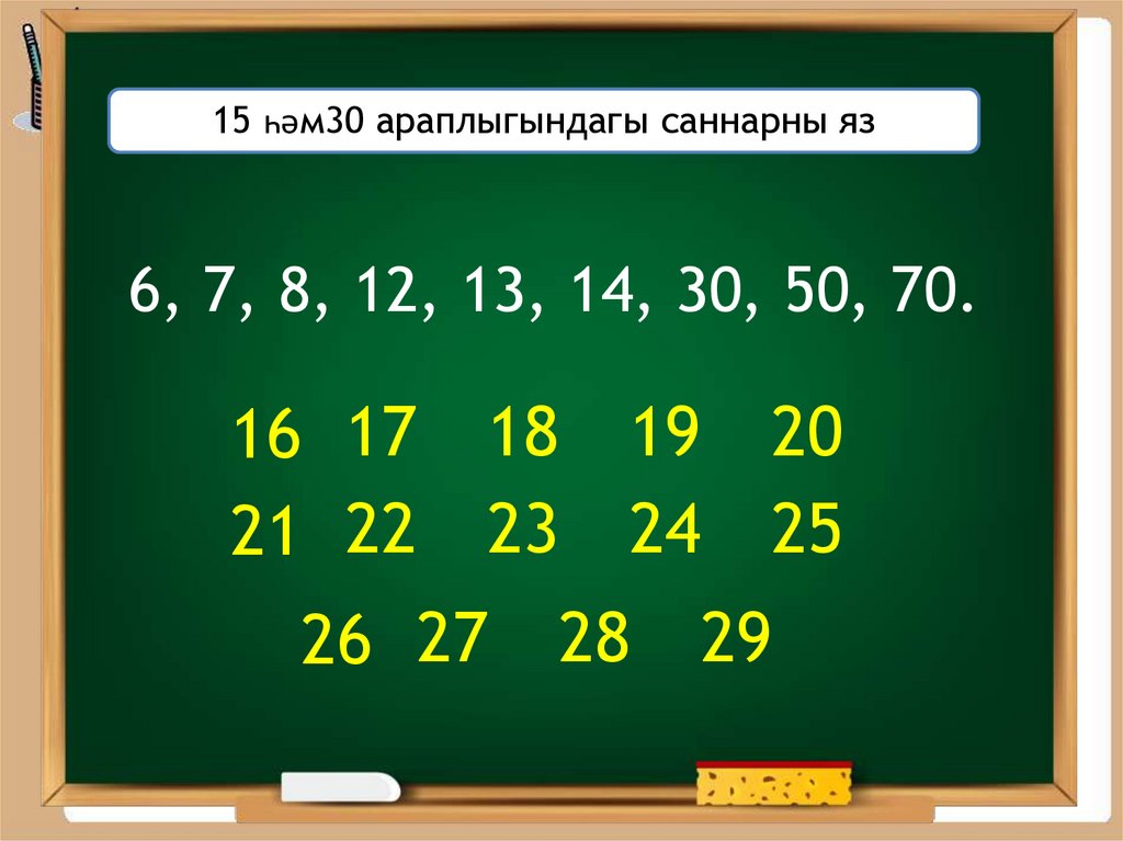 15 һәм30 араплыгындагы саннарны яз6, 7, 8, 12, 13, 14, 30, 50, 70.