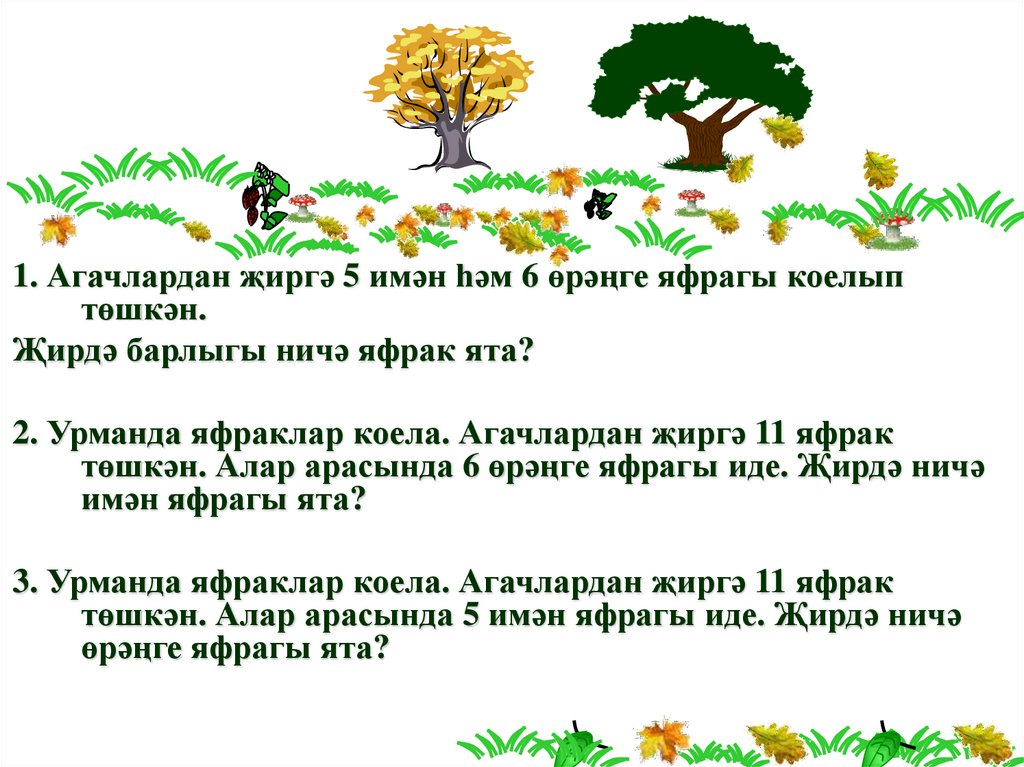 1. Агачлардан җиргә 5 имән һәм 6 өрәңге яфрагы коелыптөшкән.