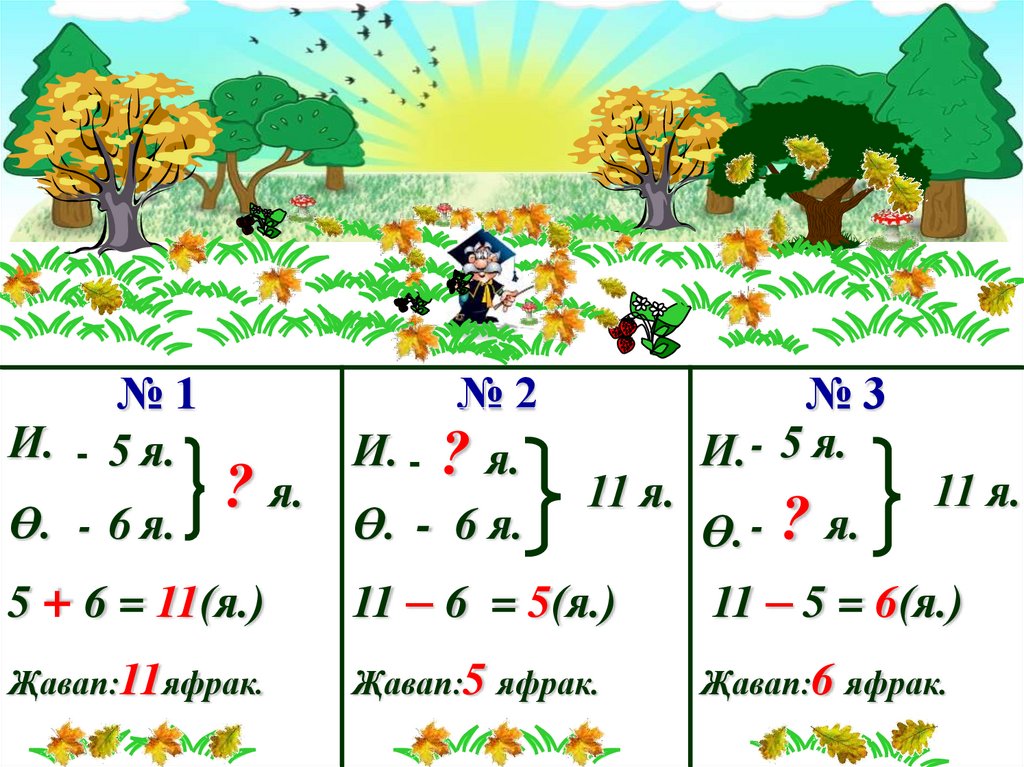2. Урманда яфраклар коела. Агачлардан җиргә 11 яфрак