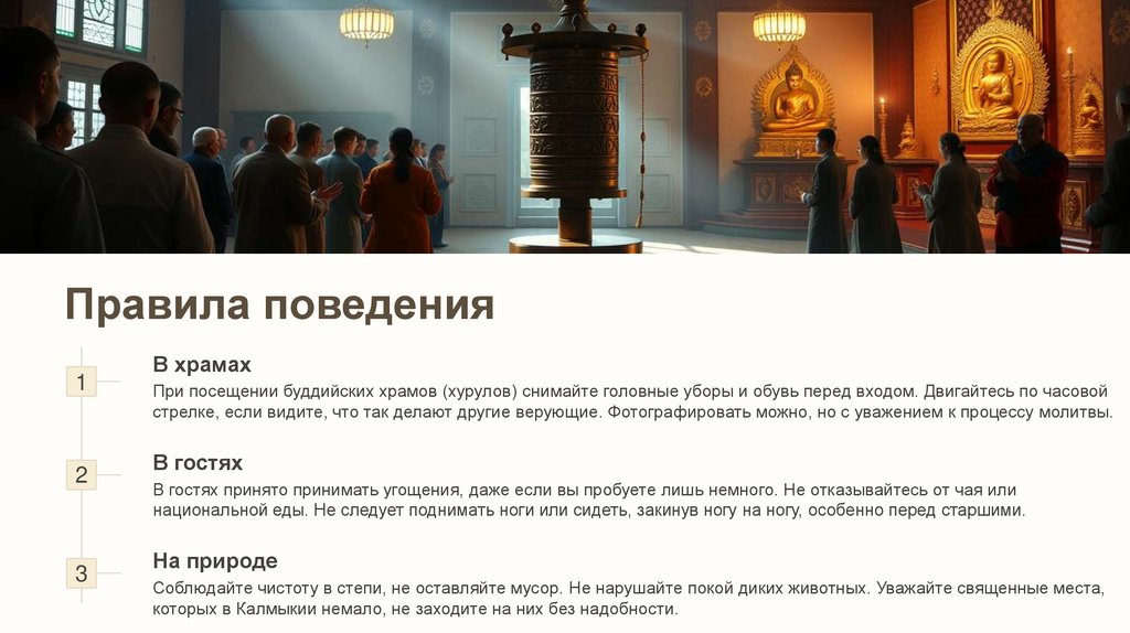 При посещении буддийских храмов (хурулов) снимайте головные уборы и обувь перед входом. Двигайтесь по часовой