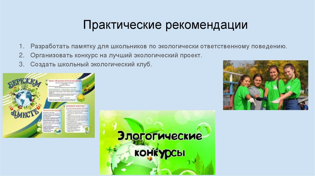 Практические рекомендации1. Разработать памятку для школьников по экологически ответственному поведению.