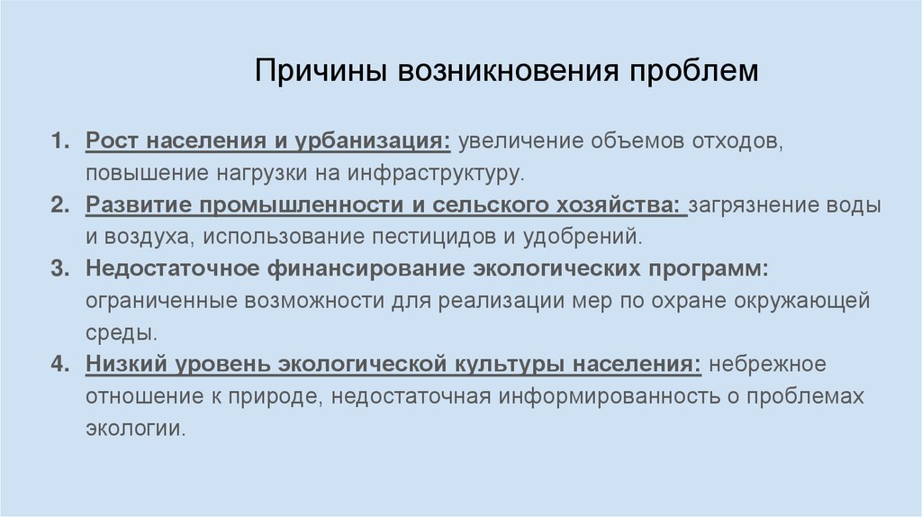 Причины возникновения проблем1. Рост населения и урбанизация: увеличение объемов отходов,