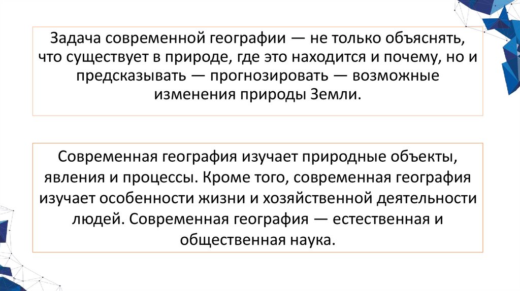 Задача современной географии — не только объяснять,что существует в природе, где это находится и почему, но и