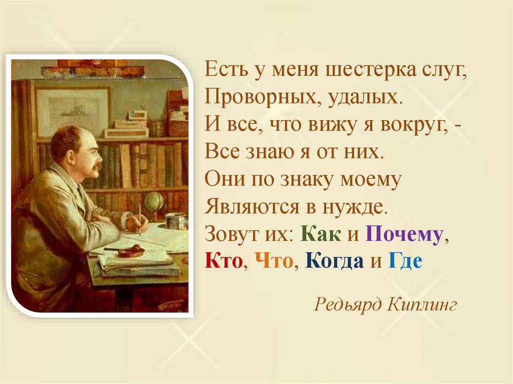 Есть у меня шестерка слуг,Проворных, удалых.