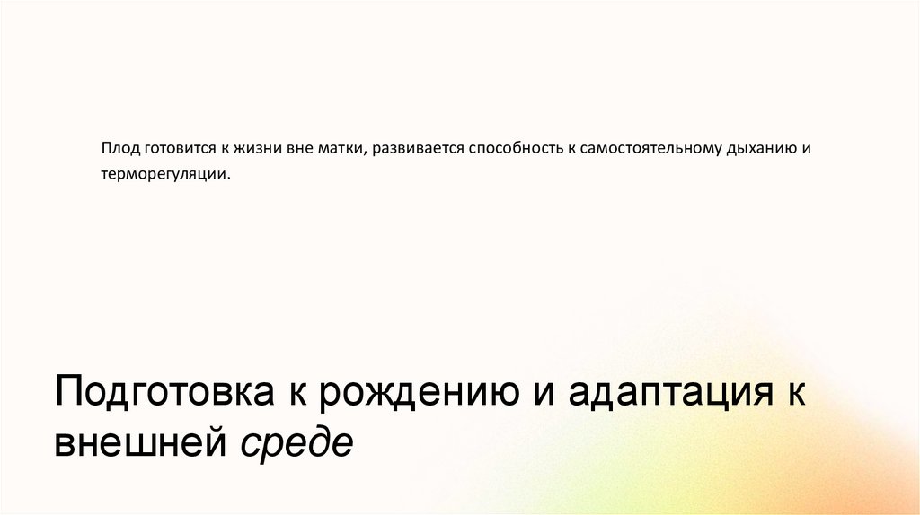 Плод готовится к жизни вне матки, развивается способность к самостоятельному дыханию итерморегуляции.