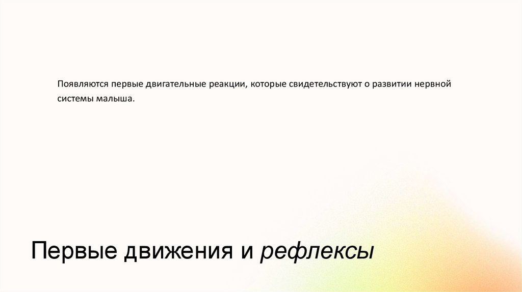Появляются первые двигательные реакции, которые свидетельствуют о развитии нервнойсистемы малыша.