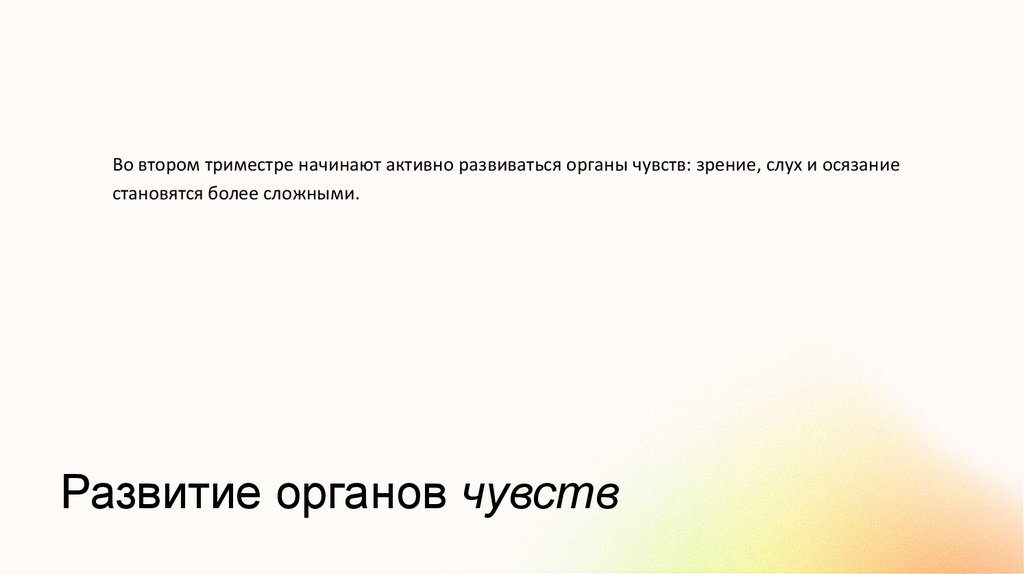 Во втором триместре начинают активно развиваться органы чувств: зрение, слух и осязаниестановятся более сложными.
