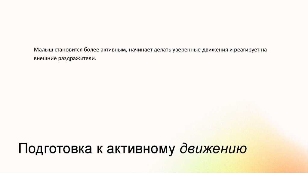 Малыш становится более активным, начинает делать уверенные движения и реагирует навнешние раздражители.