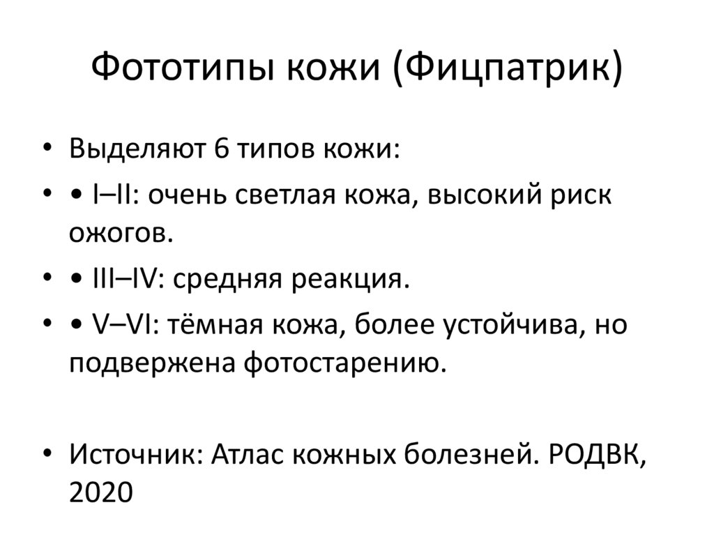 Фототипы кожи (Фицпатрик)• Выделяют 6 типов кожи: