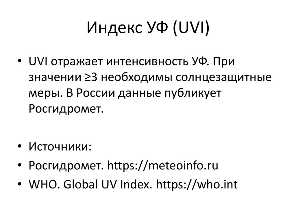 Индекс УФ (UVI)• UVI отражает интенсивность УФ. При