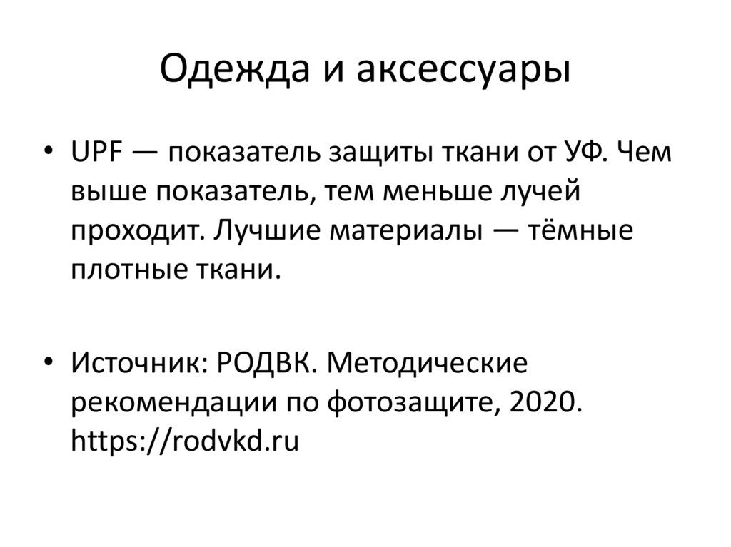 Одежда и аксессуары• UPF — показатель защиты ткани от УФ. Чем