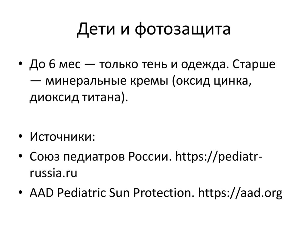 Дети и фотозащита• До 6 мес — только тень и одежда. Старше