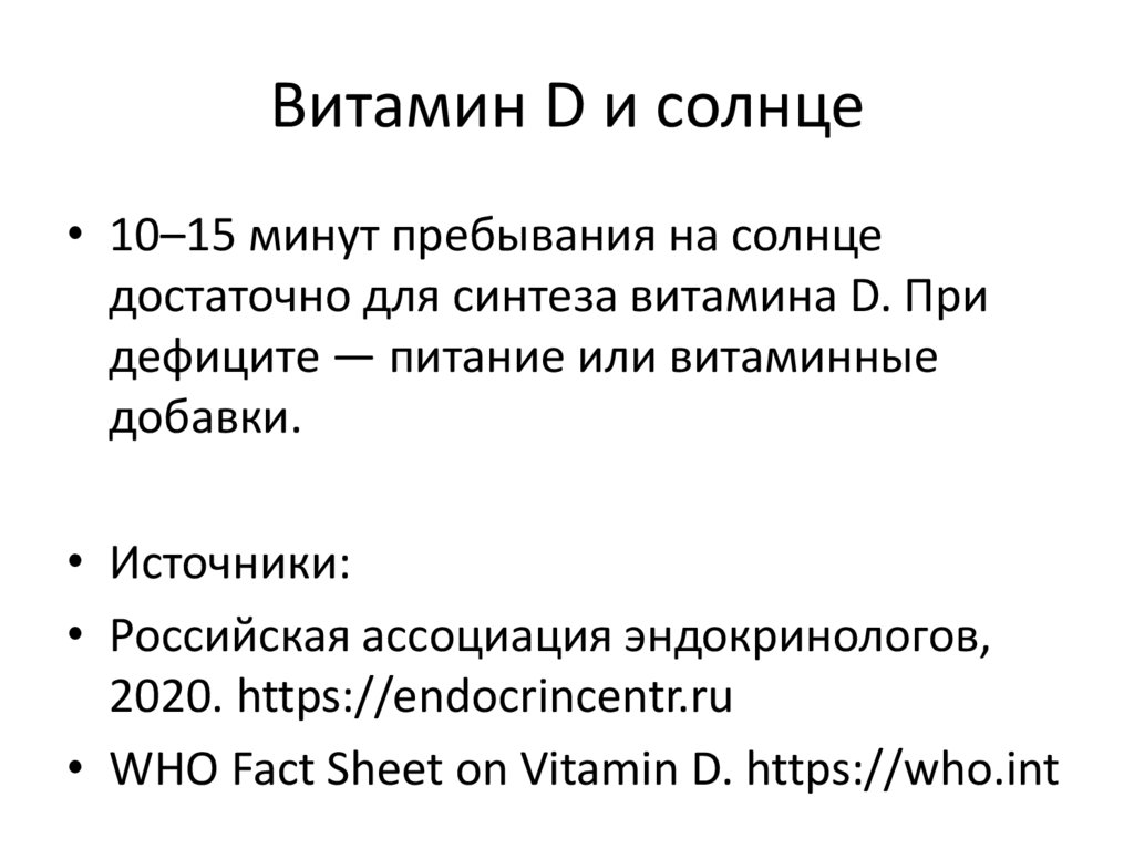 Витамин D и солнце• 10–15 минут пребывания на солнце