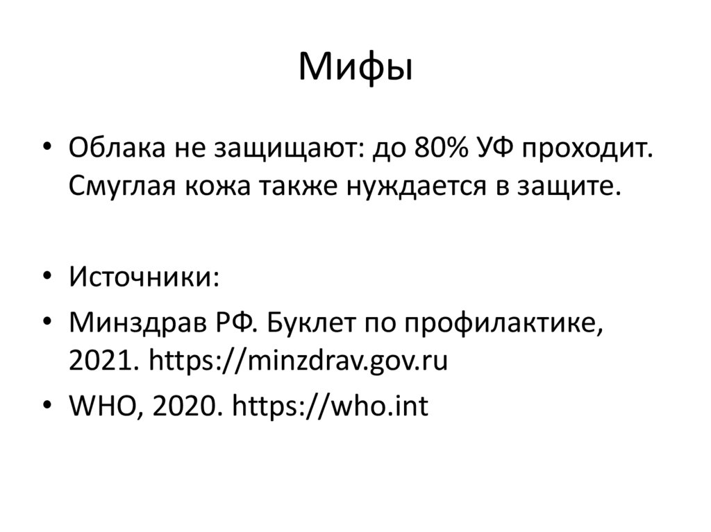 Мифы• Облака не защищают: до 80% УФ проходит.