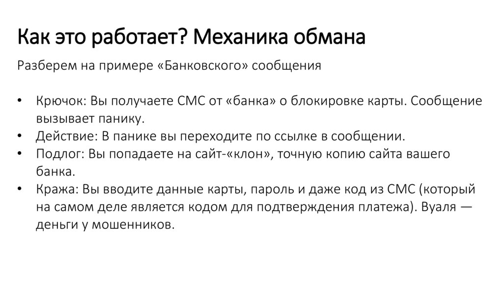 Как это работает? Механика обманаРазберем на примере «Банковского» сообщения