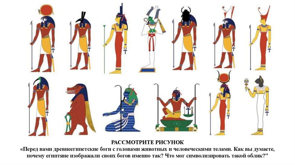 РАССМОТРИТЕ РИСУНОК«Перед вами древнеегипетские боги с головами животных и человеческими телами. Как вы думаете,